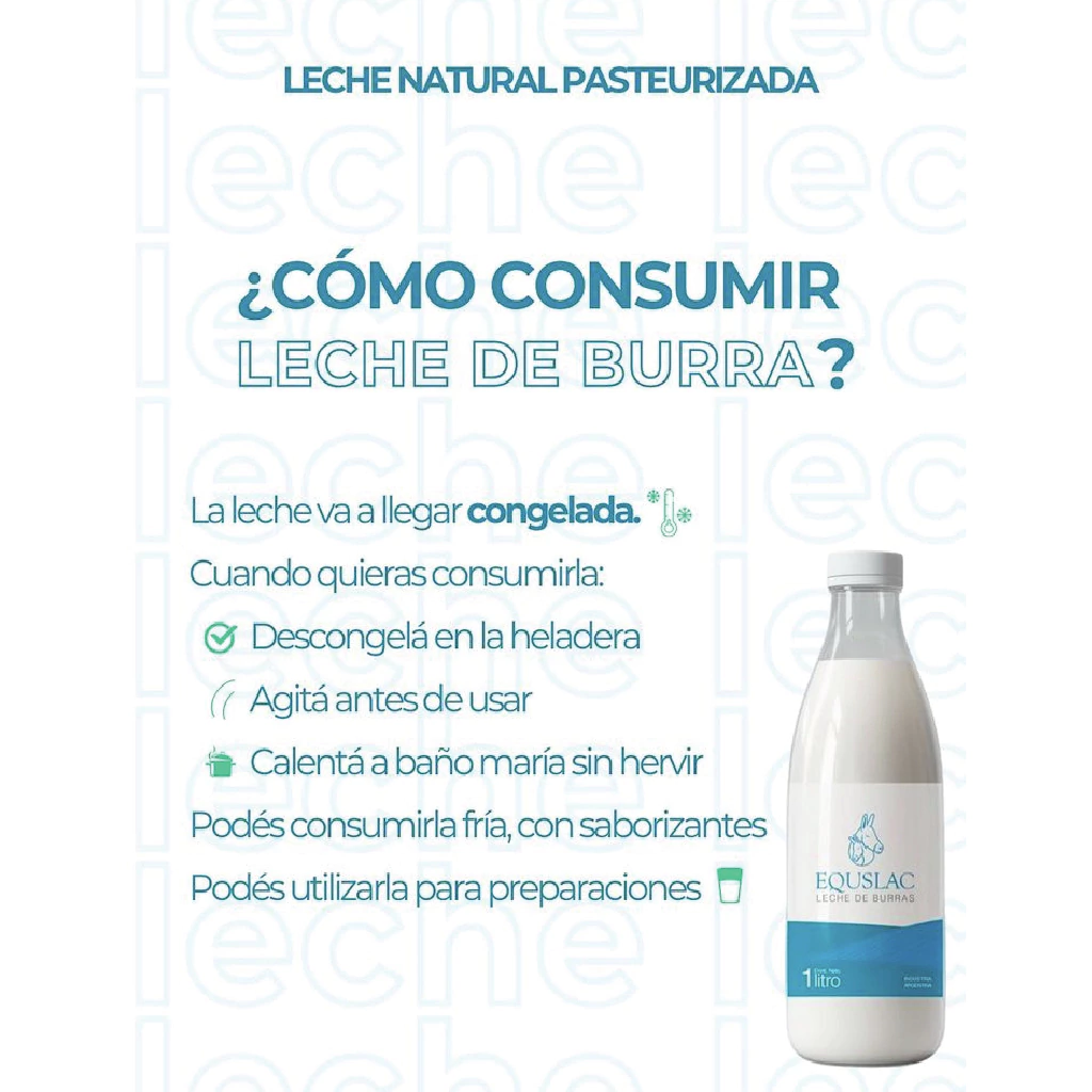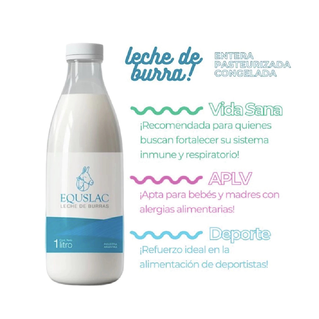 Leche de Burra entera, pasteurizada y congelada. Alimento sano, nutritivo y natural. Producido de manera sustentable por burras alimentadas a campo con pastos libres de agroquimicos.