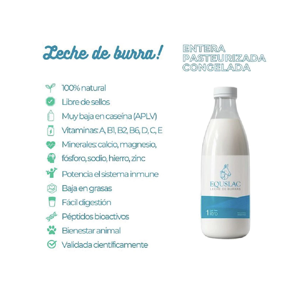 Leche de Burra entera, pasteurizada y congelada. Alimento sano, nutritivo y natural. Producido de manera sustentable por burras alimentadas a campo con pastos libres de agroquimicos.